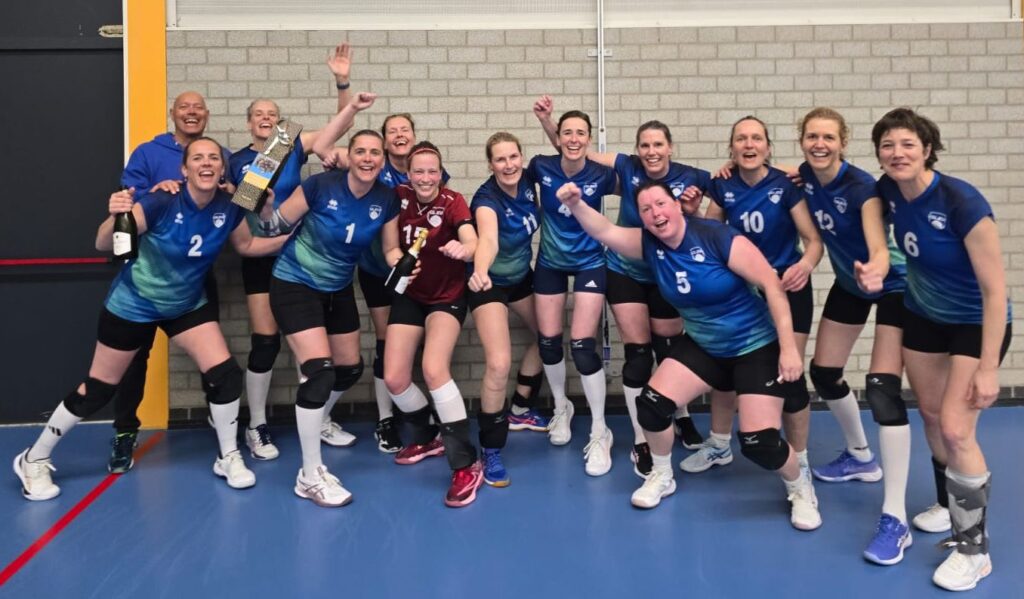 Aan het begin van de avond zag het er nog niet naar uit dat het deze week al zou lukken. VSTS D1, de nummer 2 in de poule, overklaste ons op alle fronten in de eerste twee sets. Ondanks moedige pogingen van onze verdediging om de kanonskogels tegen te houden, lukte het VSTS in beide sets om vanaf het begin uit te lopen tot een comfortabele voorsprong. Waar bij de tegenstander alles lukte, hadden wij moeite om tot scoren te komen. De sets gingen met 25-16 en 25-21 naar de thuisploeg. We lieten ons niet gek maken en van de wedstrijd in december wisten we dat na een 2-0 achterstand ook nog van alles mogelijk was. Met overtuiging begonnen we de derde set. Het lukte om op voorsprong te komen. VSTS kwam nog gevaarlijk terug, maar uiteindelijk werd de set door hard vechten binnengehaald (25-27). In de vierde set kregen we vleugels. Harde knallen werden afgewisseld met lepe balletjes in de hoeken van het veld. Met 19-25 ging de set naar Volevo. Stiekem hadden coach Dennis en aanvoerster Annique de stand van de nummer 3 in de poule in de gaten gehouden. Zij hadden een set laten liggen, dus het kampioenschap was een feit. Wat een ontlading en ongeloof dat de buit toch vanavond al binnen was!! In de vijfde set lukte het zelfs om de wedstrijd te winnen (13-15). Wat een feest!!! Stiekem bleken toch de nodige champagneflessen en toeters meegenomen te zijn naar Bodegraven. Er werd geproost en gezongen, we are the champions schalde door de kleedkamer en kantine. Het is ons weer gelukt…